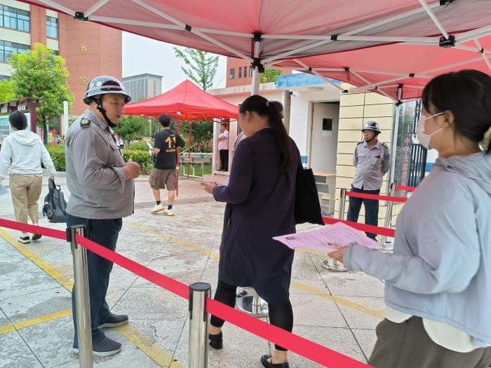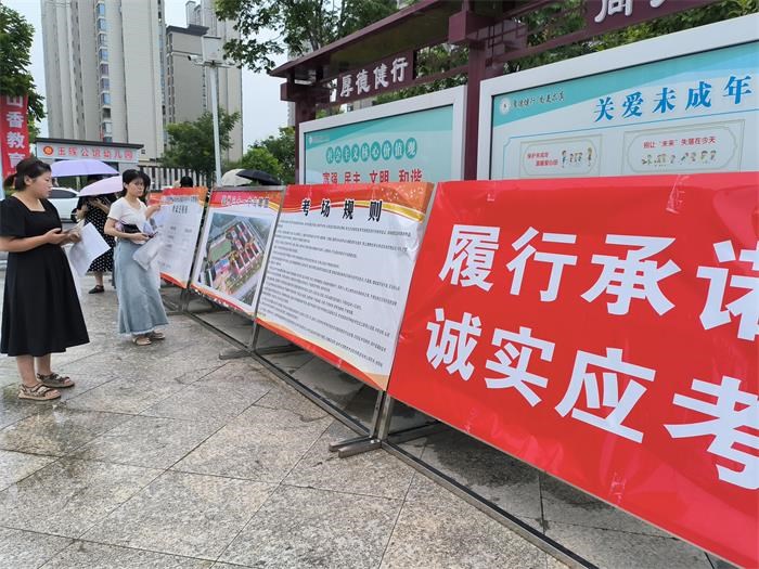 当日早上,考点大门外,无线电监控人员提前到岗,无线电监控设备开始运行。考试宣传展板前,不时有考生围过来查看考场信息和考风考纪要求。考点工作人员拿着大喇叭一边维持场外秩序,一边提醒考试注意事项。8:20,考点几条入场通道同时开启,在工作人员的引导下,考生凭身份证和准考证有序进入考点。