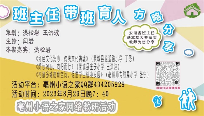 8月29日晚7:40,“亳州小语之家”网络教研平台特邀3位经验丰富的班主任分享个人带班育人方略,在开学前夕为老师们在班级管理方面提供针对性指导。来自全国各地的200多位班主任老师参与此次网络教研活动。