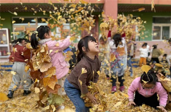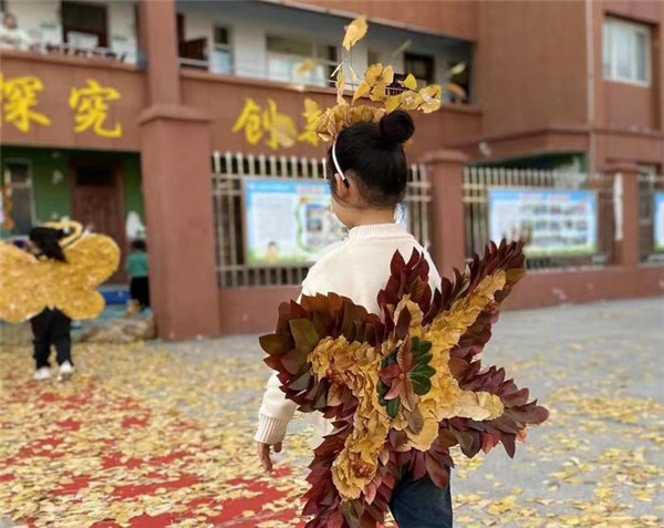 “现在正是银杏叶纷飞,赏银杏的好时节。我们想着,纷飞的落叶怎么能变成一种教育资源,变成孩子们最美的童年记忆呢?于是,我们决定把落叶搬进幼儿园,让孩子们体验一场落叶雨。”十九里中心小学附属园园长张秋雨说。