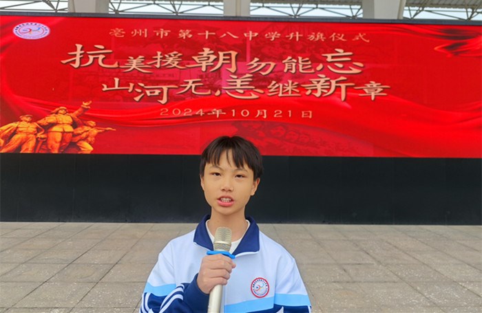 10月21日,亳州十八中举行纪念抗美援朝74周年主题升旗仪式。仪式由叶金老师与八(7)班的王诗蕊同学主持。