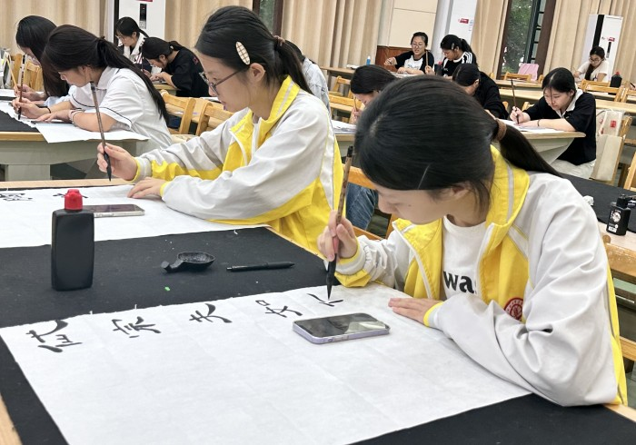 比赛现场秩序井然,选手们凝神静气、伏案挥毫。书写内容统一指定,既聚焦普通话推广的核心要义,强调书写规范汉字,又融入经典文化元素。以笔墨为媒介,规范汉字与文化经典在纸墨间深度融合。选手需要在规定时间内完成创作,这充分考验了书写规范性与艺术表现力。评委组共收到有效参赛作品50余幅,每一幅作品都展现了同学们对规范汉字的认真态度和对书法艺术的热爱。
