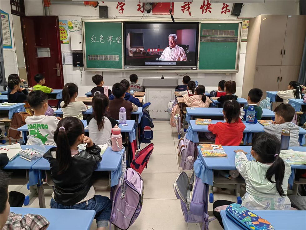 党员教师佩戴党员徽章,利用班会时间为孩子们讲述《半条被子》《小英雄雨来》等红色故事;部分班级播放《建国大业》《闪闪的红星》精选片段,黑板报统一更换为“中国红”背景,教室内外洋溢着庄重而温暖的节日氛围。