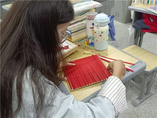 此外,学生们充分发挥想象力和创造力,运用红色的竹条,编织出“欢度国庆”“中国梦”等字样的竹编画。一幅幅精美的竹编画,不仅展现了传统手工艺的魅力,更传递了同学们对祖国生日的深情祝福。