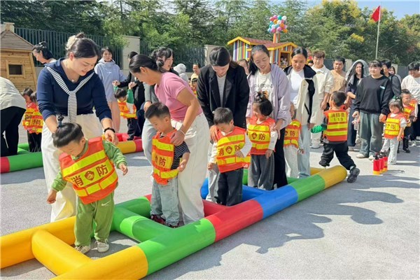 亲子运动会环节气氛热烈,孩子们换上消防服装,化身精神抖擞的“小小消防员”。“云梯竞技”中,亲子五人组协作攀爬、穿越障碍,专注神情尽显担当;“担架救援接力赛”里,家长们稳步运送“小伤员”,默契配合完成救援任务;家长们躬身搭起的生命“传送带”,更将爱与守护转化为稳稳的托举。