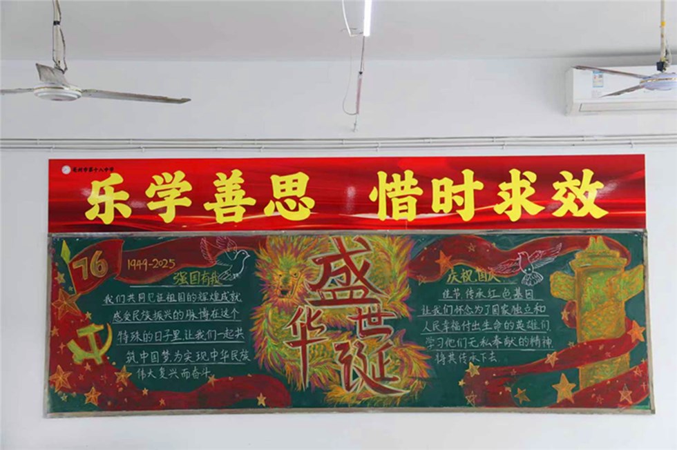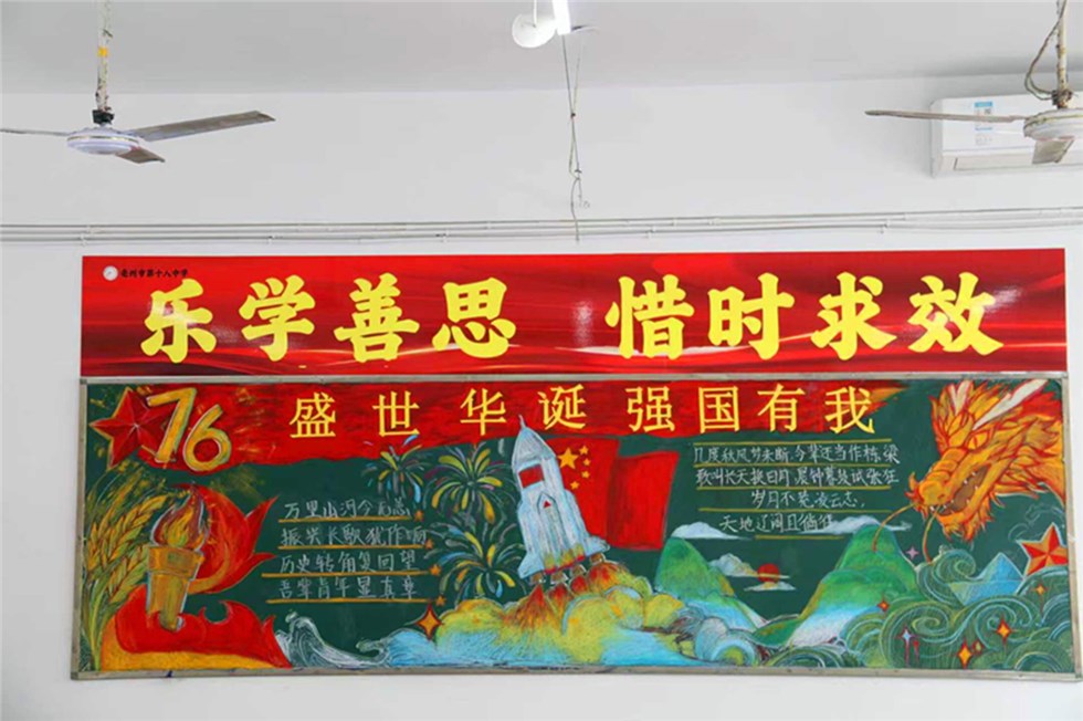 为庆祝中华人民共和国成立76周年,深化爱国主义教育,丰富校园文化生活,亳州十八中于近日举办了“盛世华诞,强国有我”主题黑板报比赛。