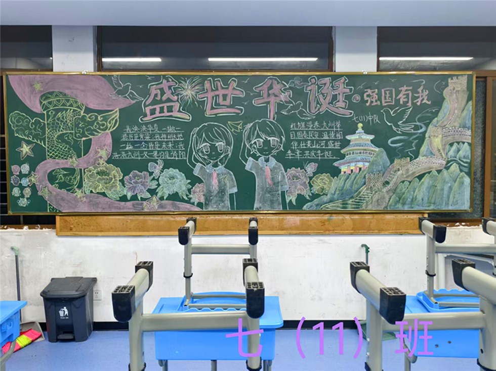 走进七年级各班级,一幅幅主题鲜明、创意纷呈的黑板报成为教室中最亮丽的风景。这些作品或勾勒五星红旗迎风飘扬的壮美画面,或描绘嫦娥奔月、玉兔捣药的浪漫传说,表达着学生们的拳拳爱国情怀。