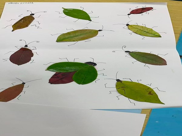 活动中,学生们化身“小小测量师”,收集形态各异的落叶。他们小心翼翼地将叶片平铺,用尺子精准测量每片叶子的长度与宽度,记录下具体数值后,通过对比数据“比大小”,直观理解“长短”“多少”的数学概念。活动还融入了“轴对称图形”的知识探索,学生不仅观察落叶的叶脉纹路、蝴蝶的翅膀形态,寻找生活中的对称美,还将收集到的落叶、树枝、花瓣等自然材料作为“画笔”,拼贴出蝴蝶、花朵、小动物等充满童趣的轴对称图案。