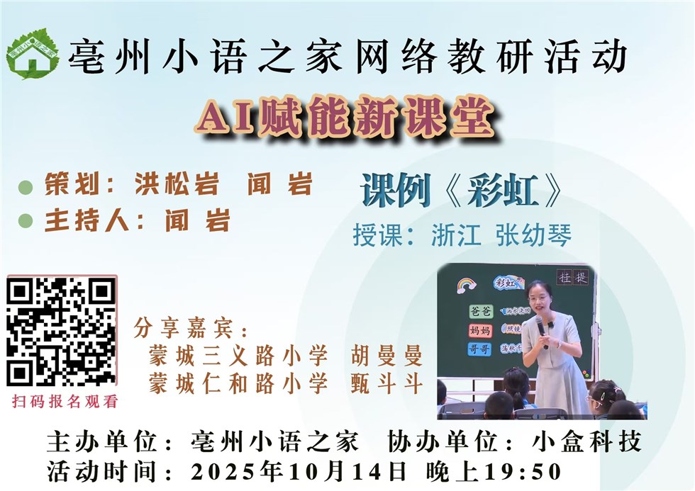 10月14日晚,“亳州小语之家”网络教研活动以“AI赋能新课堂”为主题,聚焦小学语文低年级教学创新领域,通过示范课观摩、实践经验分享两个环节,为一线小学语文教师搭建AI技术与课堂教学相融合的交流平台,吸引2000多名教师实时参与直播互动,共探教学新方向。