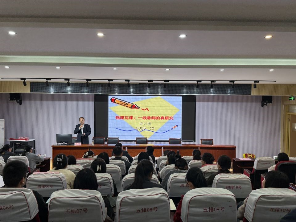 谯城区牛集中心校的梁万明老师以《物理写课:一线教师的真研究》为题进行主题讲座,从是什么、为什么、怎么写三个方面对写课进行分析,强调写课是为了提炼思想,更好地服务于教学,是教师必备的“六课”技能之一。此外,他还就走出低效教研的路径探索进行分享,指出传统规范与学术规范掺杂等问题,强调写课在其中的作用。