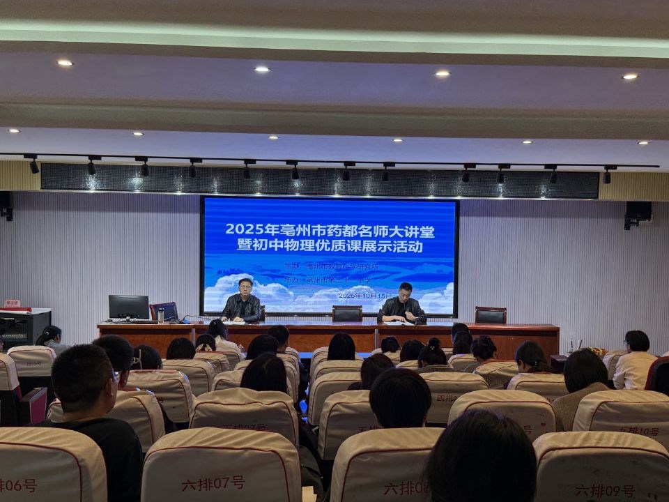10月15日,“药都名师大讲堂”暨初中物理优质课展示活动在亳州市第三十一中学举行。全市物理学科教研员、市初中物理学科指导组全体成员、各县区和市直学校初中物理骨干教师共60人参加活动。活动由市初中物理学科指导组组长刘书超主持。