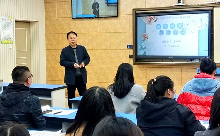 活动最后,主持人于永军作《依文而教,随文而写》主题讲座,畅谈写作教学实践新路径。他以八年级上册第二单元内几篇经典文本为依托,构建起“一课一练”的随笔创作练笔模式。他以大量的写作案例,为与会听众呈现了对每篇课文写作教学点的挖掘角度,让随文写作有章可循,有法可学,努力实现“学文”与“习写”的无缝衔接。