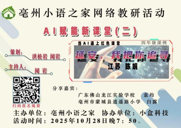 10月28日,“亳州小语之家”举办第二期以“AI赋能新课堂”为主题的网络教研活动。来自全国各地的百余名小语教师相聚云端,共同观摩江苏省特级教师、昆山市柏庐实验小学校长陈娟执教的优秀课例《延安,我把你追寻》,在传统经典与前沿科技的碰撞中探寻小语教学新路径。