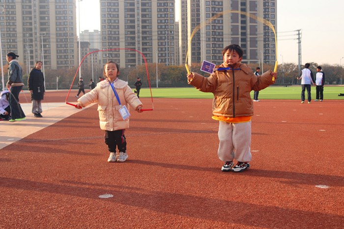 本次联赛设置了个人单摇、双摇、双人一带一、集体长绳“8”字跳等8个大项8个组别,覆盖幼儿园、中小学学生,兼顾了不同年龄段学生的运动能力与参与热情。赛场上,小选手们各显神通,展现出扎实的训练功底与灵动的竞技风采。个人单摇项目中,选手们手握绳柄快速挥摇,跳绳在空中划出一道道优美的弧线,脚尖轻点地面如蜻蜓点水,速度之快令人目不暇接,现场观众不时发出阵阵惊叹;双人一带一项目里,搭档之间配合默契,一人带跳沉稳有力,一人跟随轻盈灵动,同步的节奏、协调的动作彰显着彼此的默契;集体长绳“8”字跳赛场更是精彩纷呈,摇绳队员凝神聚力,长绳如银蛇飞舞,队员们依次穿插跳跃,时而快速穿插,时而变换队形,整齐划一的动作勾勒出团结协作的动人图景;双人跳项目中,孩子们并肩跳跃,欢声笑语中不仅展现了参赛选手的亲密互动,更传递了健康向上的体育理念。