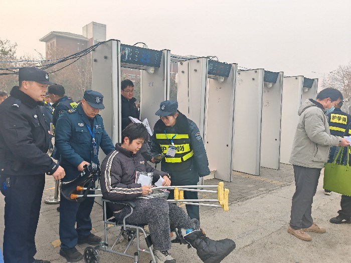 当日7:30,随着各考点大门的开启,候考的考生在安保人员和考务人员的引导下,有序依次接受身份核验和安全检查后进入考点。在安检环节,考生除了要“抬脚亮鞋底”通过智能安检门外,还要接受安检人员用金属探测仪进行的检测。在进入考场前,监考教师还要再次对考生进行安全检查,重点对考生携带的衣物、文具袋等有可能放置通讯工具或电子作弊器材的物品进行细致检查,做到技防与人防并重。
