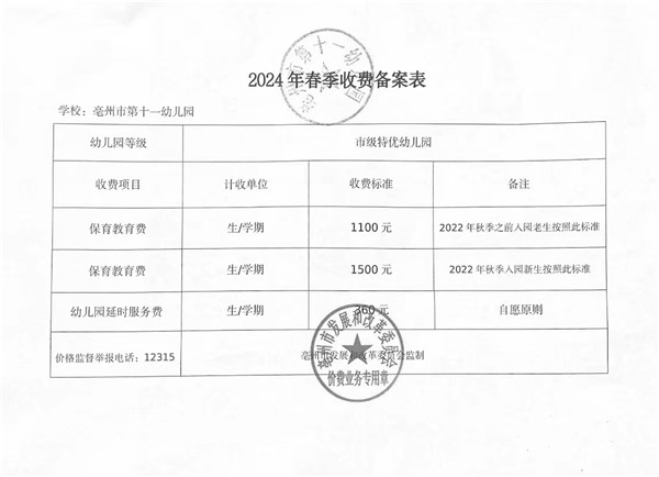 | 名称: | 亳州市第十一幼儿园2024春季收费备案表 |