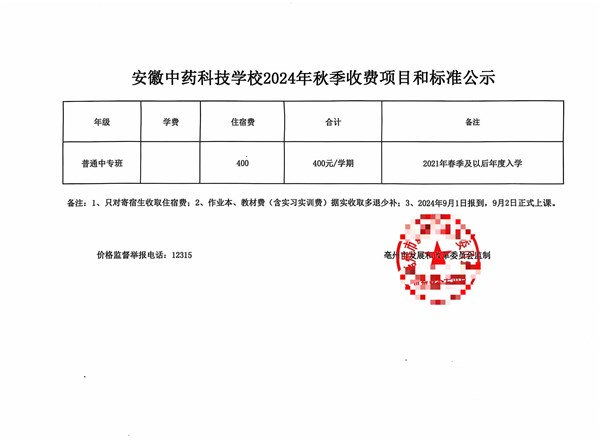 | 名称: | 安徽中药科技学校2024年秋季收费标准及项目 |
