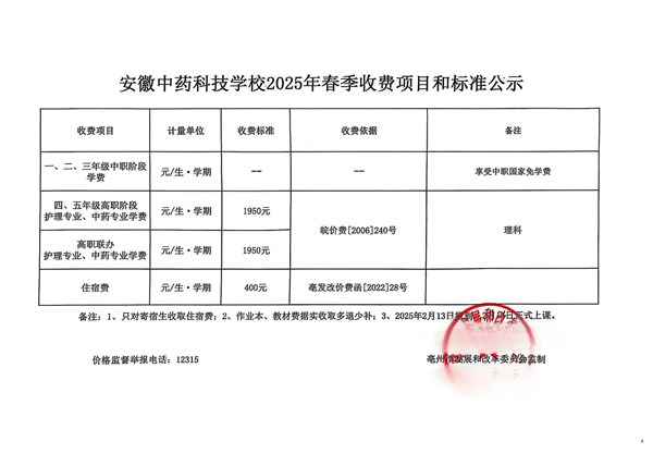 | 名称: | 安徽中药科技学校2025年春季收费标准及项目 |