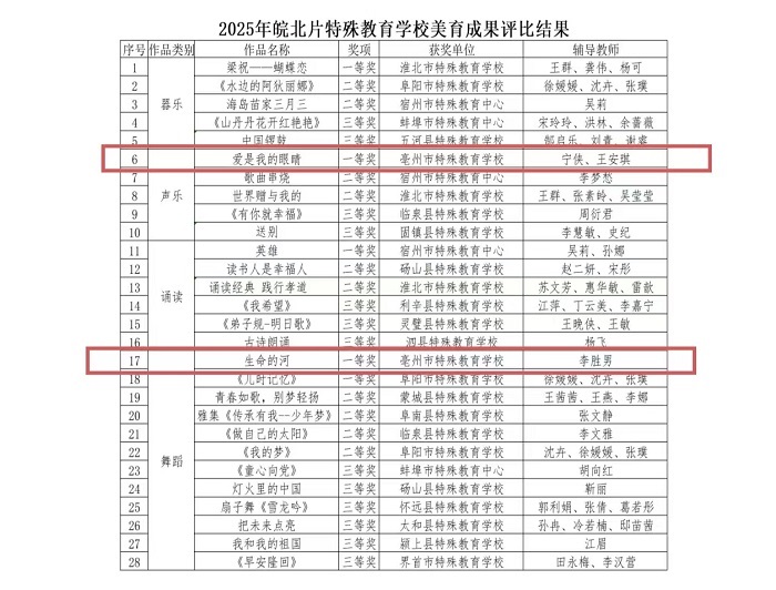 | 名称: | 亳州特教学校在2025年皖北片美育评比中斩获双一等奖 | 文号: | 无 |