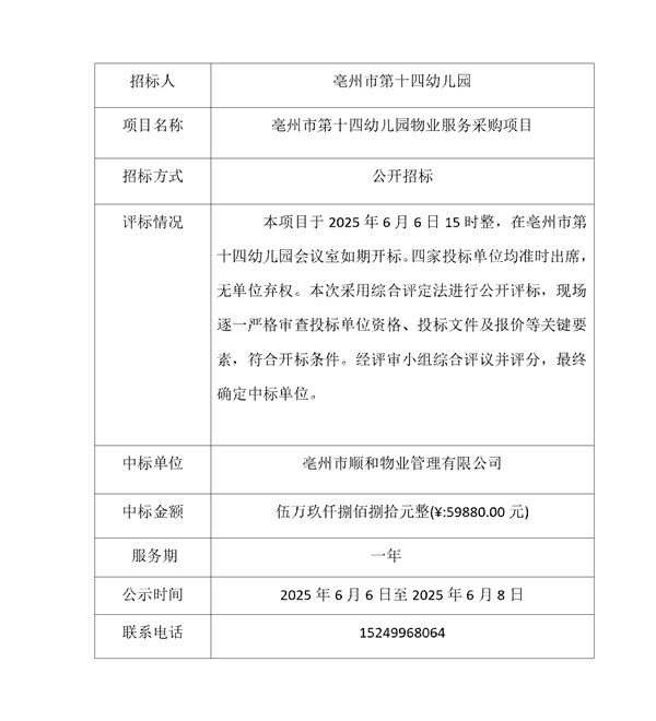 | 名称: | 亳州市第十四幼儿园2025年物业服务中标单位公示 |