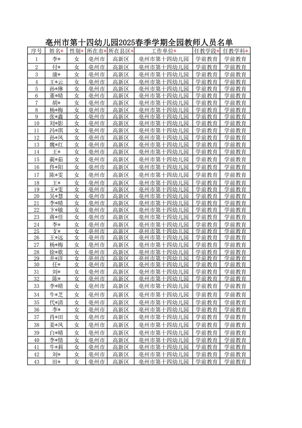 | 名称: | 亳州市第十四幼儿园2025春季学期全员教师人员名单 |